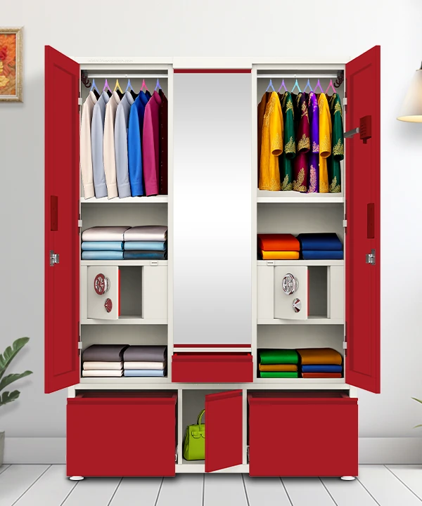 Step into a world where style meets structure. This vibrant maroon and white wardrobe is designed for those who value both aesthetics and functionality. With a secure built-in safe, spacious drawers, and a playful mix of colorful hangers, it’s more than just storage—it’s a statement.