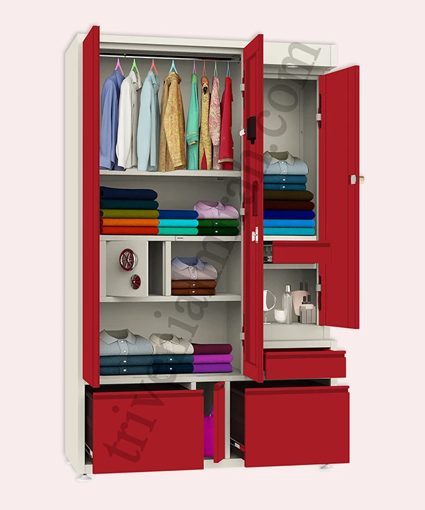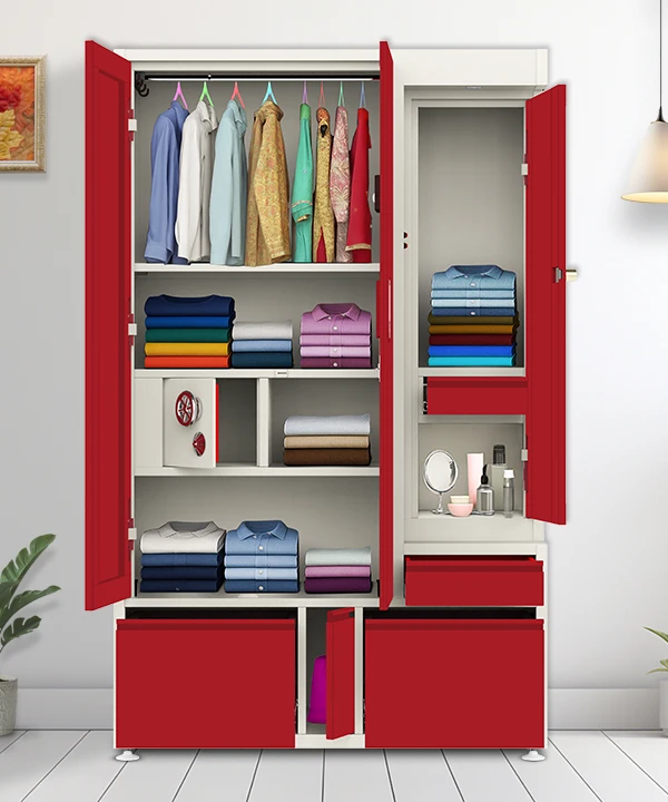 Step into a world where style meets structure. This vibrant maroon and white wardrobe is designed for those who value both aesthetics and functionality. With a secure built-in safe, spacious drawers, and a playful mix of colorful hangers, it’s more than just storage—it’s a statement.