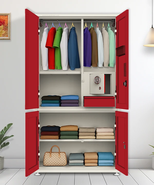 Step into a world where style meets structure. This vibrant maroon and white wardrobe is designed for those who value both aesthetics and functionality. With a secure built-in safe, spacious drawers, and a playful mix of colorful hangers, it’s more than just storage—it’s a statement.