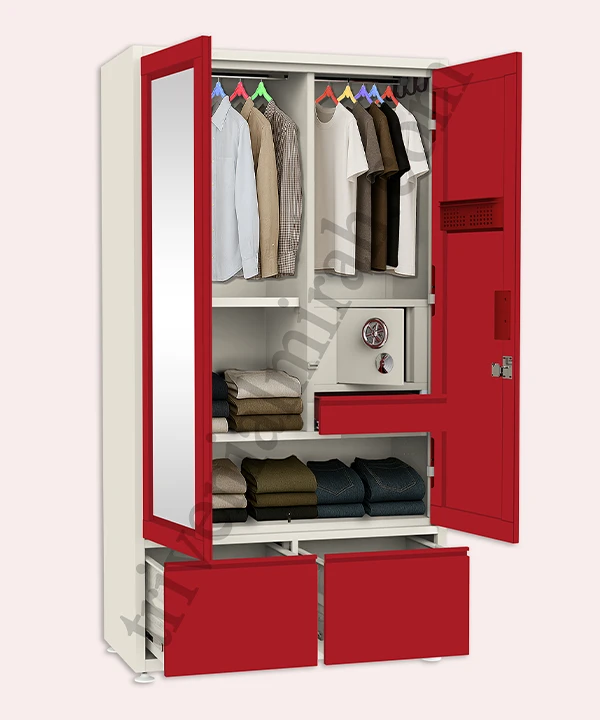Step into a world where style meets structure. This vibrant maroon and white wardrobe is designed for those who value both aesthetics and functionality. With a secure built-in safe, spacious drawers, and a playful mix of colorful hangers, it’s more than just storage—it’s a statement.