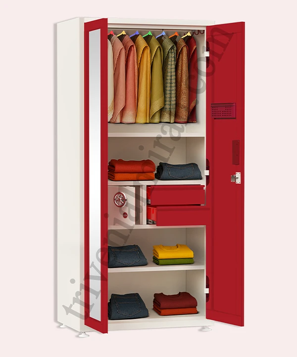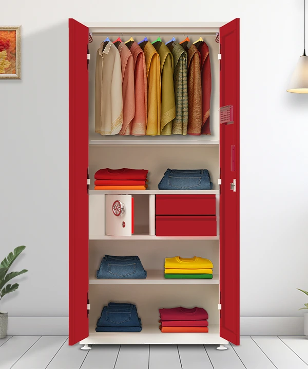Step into a world where style meets structure. This vibrant maroon and white wardrobe is designed for those who value both aesthetics and functionality. With a secure built-in safe, spacious drawers, and a playful mix of colorful hangers, it’s more than just storage—it’s a statement.