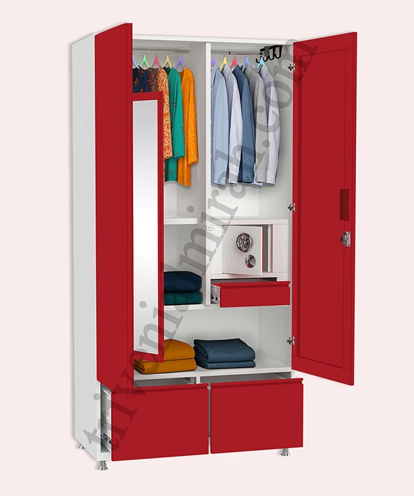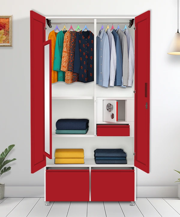 Step into a world where style meets structure. This vibrant Red and white wardrobe is designed for those who value both aesthetics and functionality. With a secure built-in safe, spacious drawers, and a playful mix of colorful hangers, it’s more than just storage—it’s a statement.