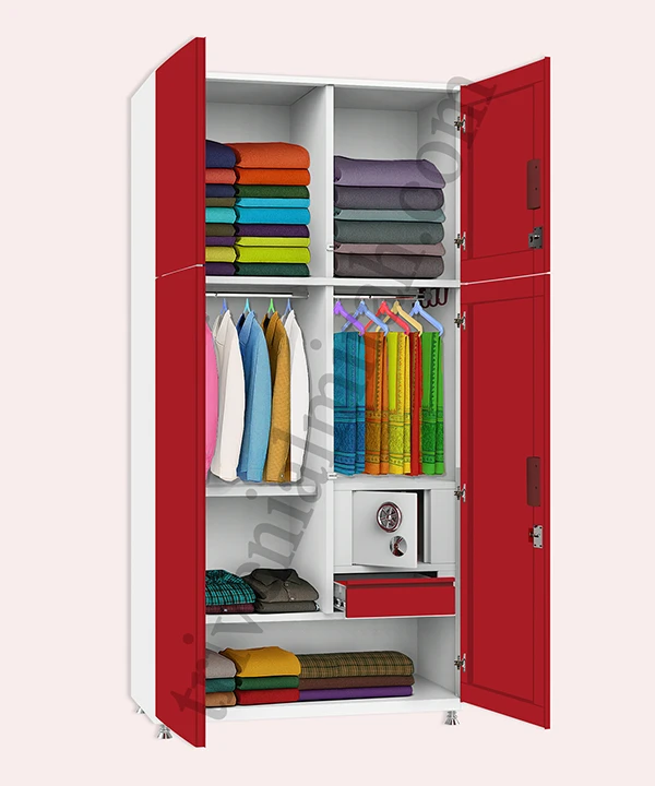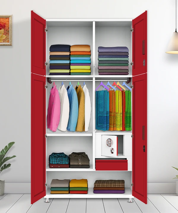 Step into a world where style meets structure. This vibrant red and white wardrobe is designed for those who value both aesthetics and functionality. With a secure built-in safe, spacious drawers, and a playful mix of colorful hangers, it’s more than just storage—it’s a statement.