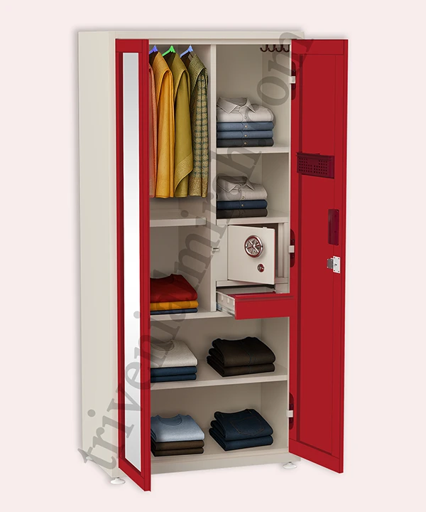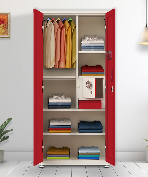 Step into a world where style meets structure. This vibrant maroon and white wardrobe is designed for those who value both aesthetics and functionality. With a secure built-in safe, spacious drawers, and a playful mix of colorful hangers, it’s more than just storage—it’s a statement.