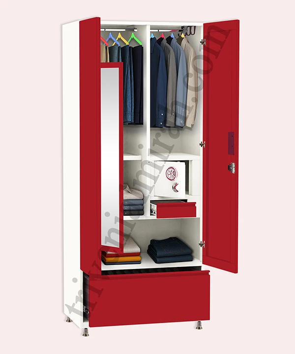 Step into a world where style meets structure. This vibrant maroon and white wardrobe is designed for those who value both aesthetics and functionality. With a secure built-in safe, spacious drawers, and a playful mix of colorful hangers, it’s more than just storage—it’s a statement.