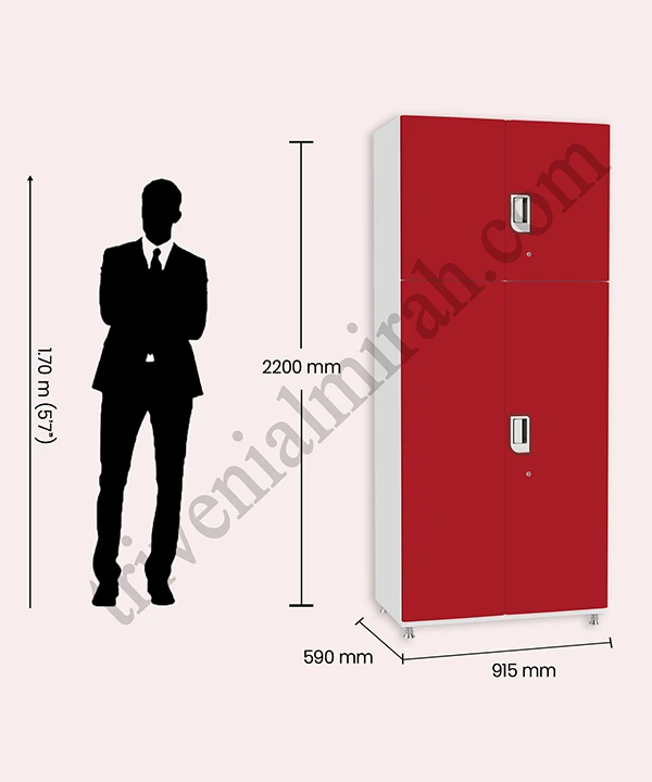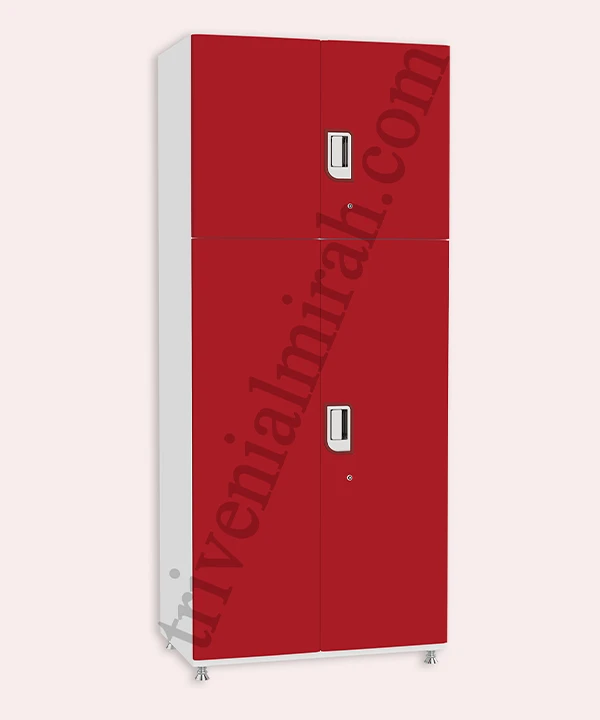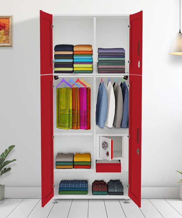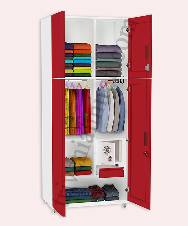 Step into a world where style meets structure. This vibrant red and white wardrobe is designed for those who value both aesthetics and functionality. With a secure built-in safe, spacious drawers, and a playful mix of colorful hangers, it’s more than just storage—it’s a statement.