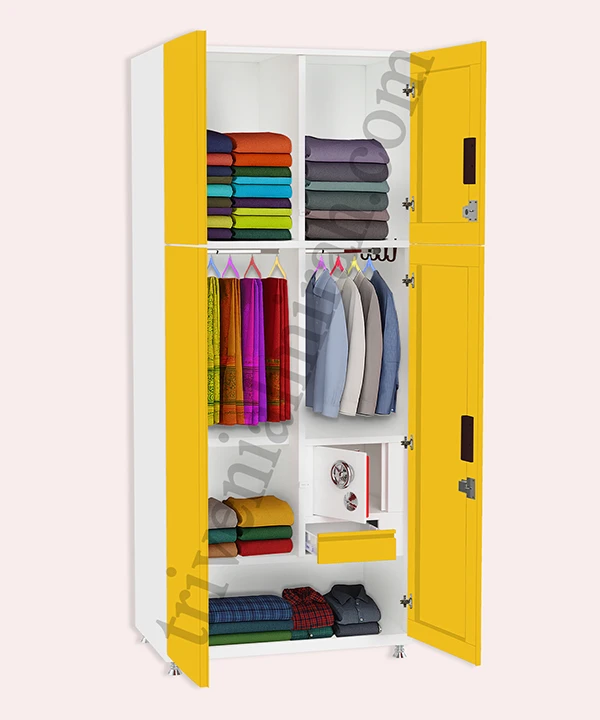 Step into a world where style meets structure. This vibrant yellow and white wardrobe is designed for those who value both aesthetics and functionality. With a secure built-in safe, spacious drawers, and a playful mix of colorful hangers, it’s more than just storage—it’s a statement.